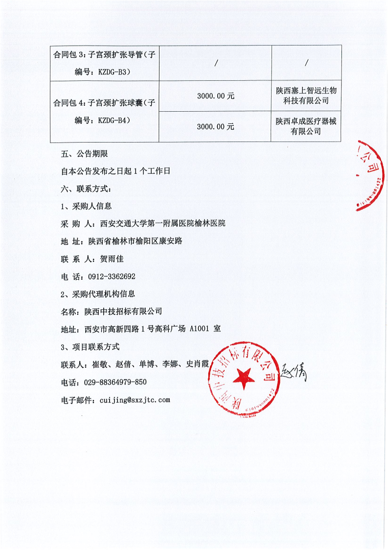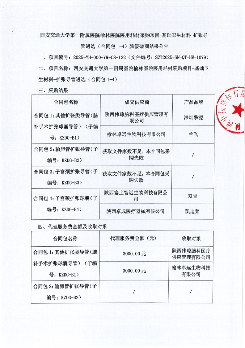 西安交通大学第一附属医院榆林医院医用耗材采购项目-基础卫生材料-扩张导管遴选(合同包1-4)院级磋商结果公告