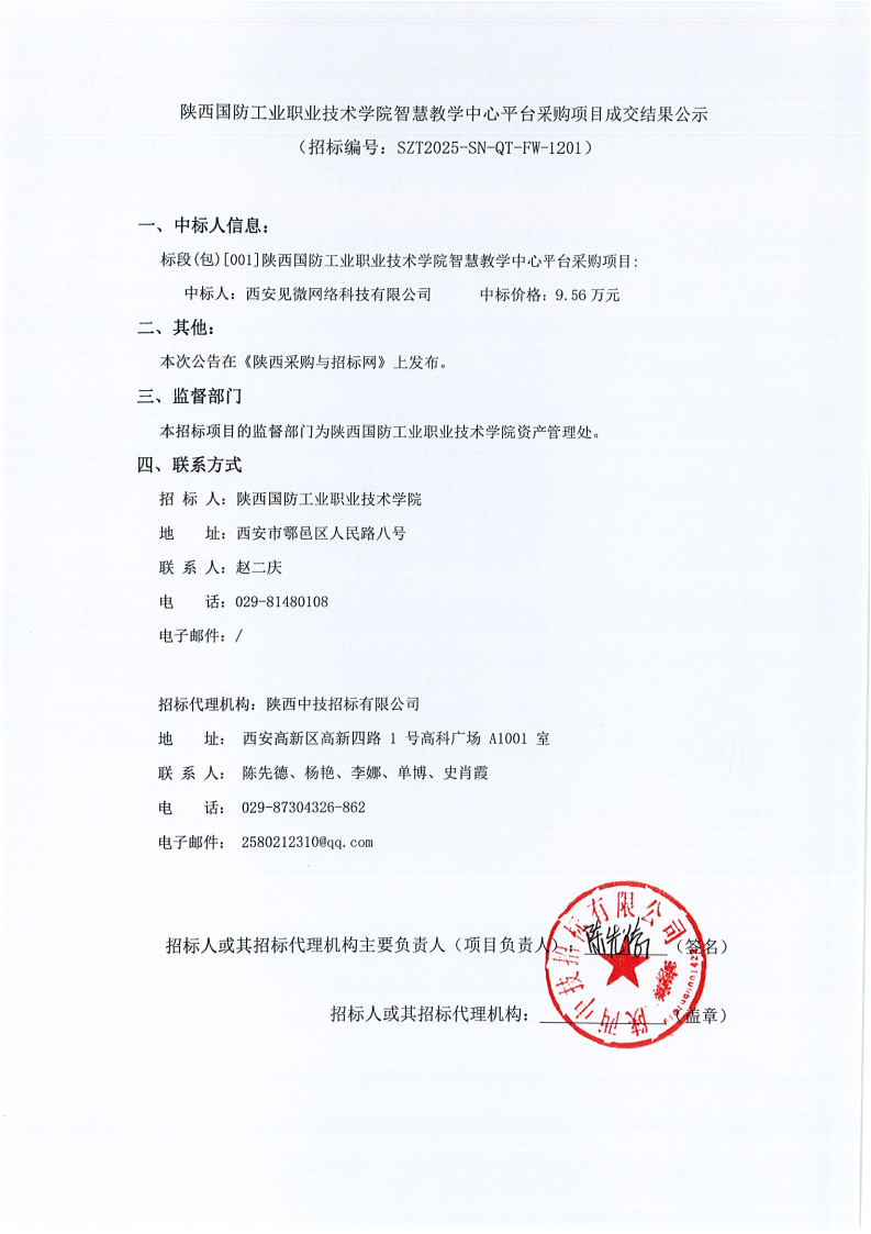 陕西国防工业职业技术学院智慧教学中心平台采购项目成交结果公示