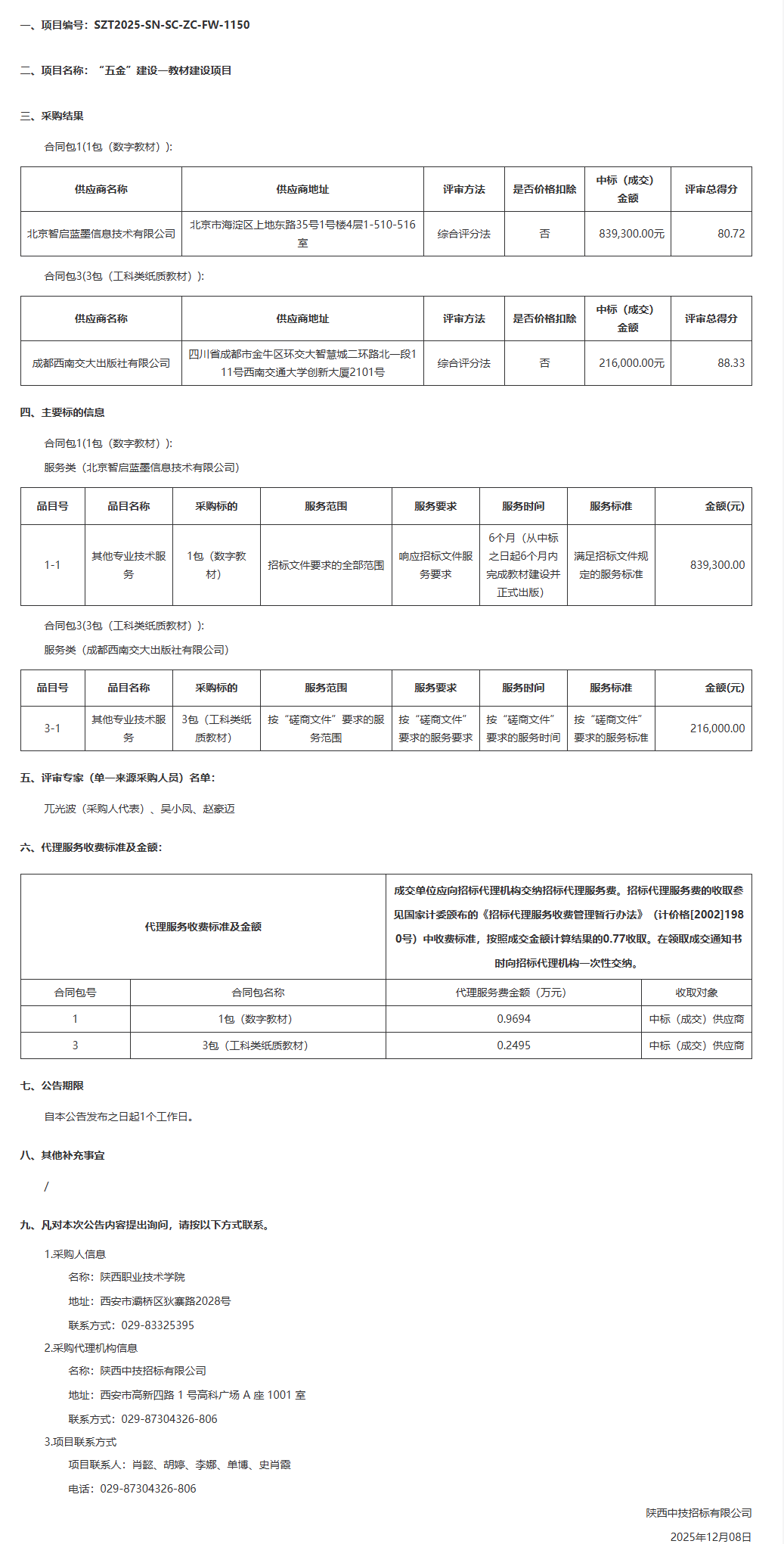 陕西职业技术学院“五金”建设一教材建设项目中标(成交)结果公告