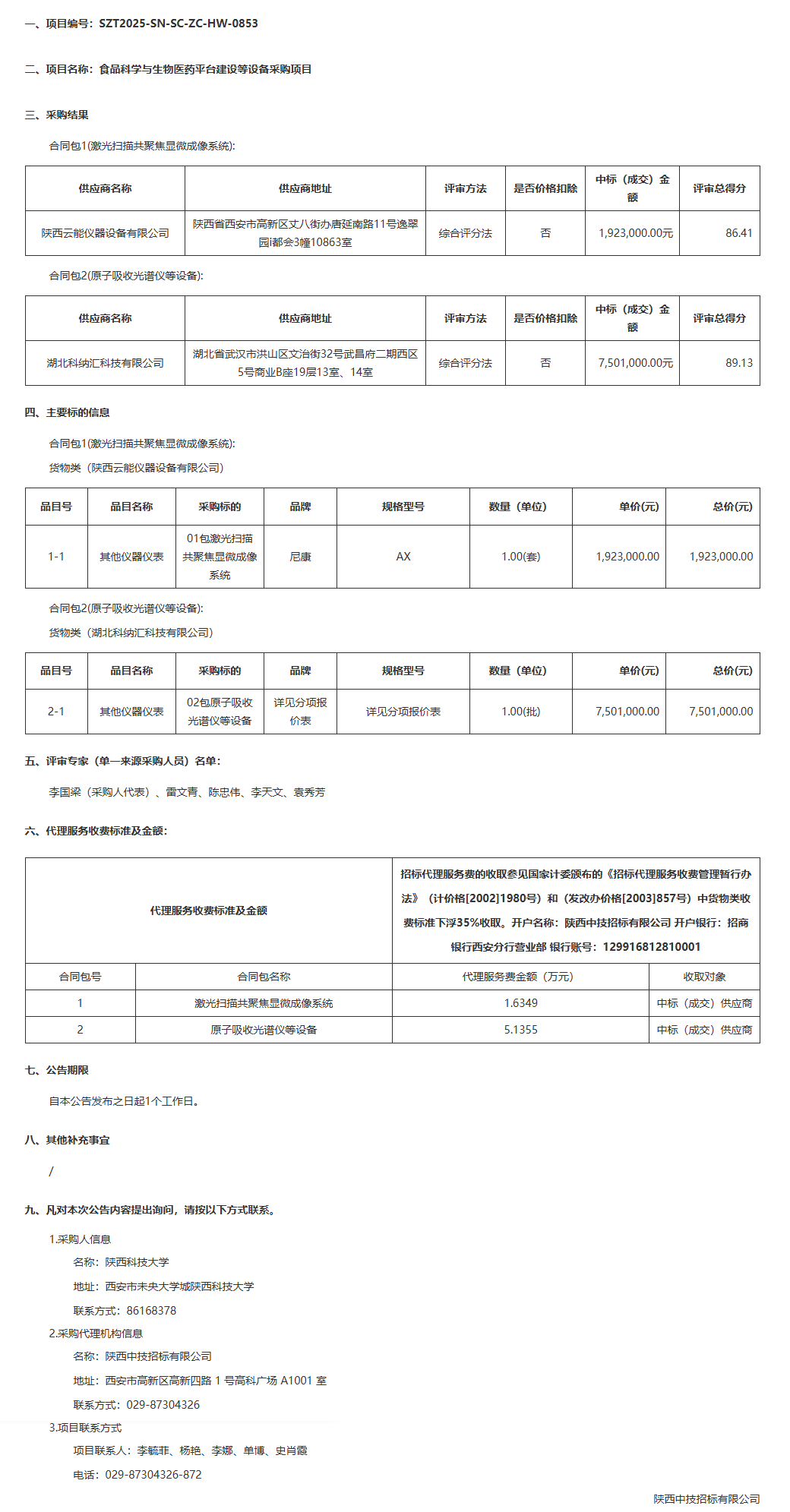 陕西科技大学食品科学与生物医药平台建设等设备采购项目中标(成交)结果公告