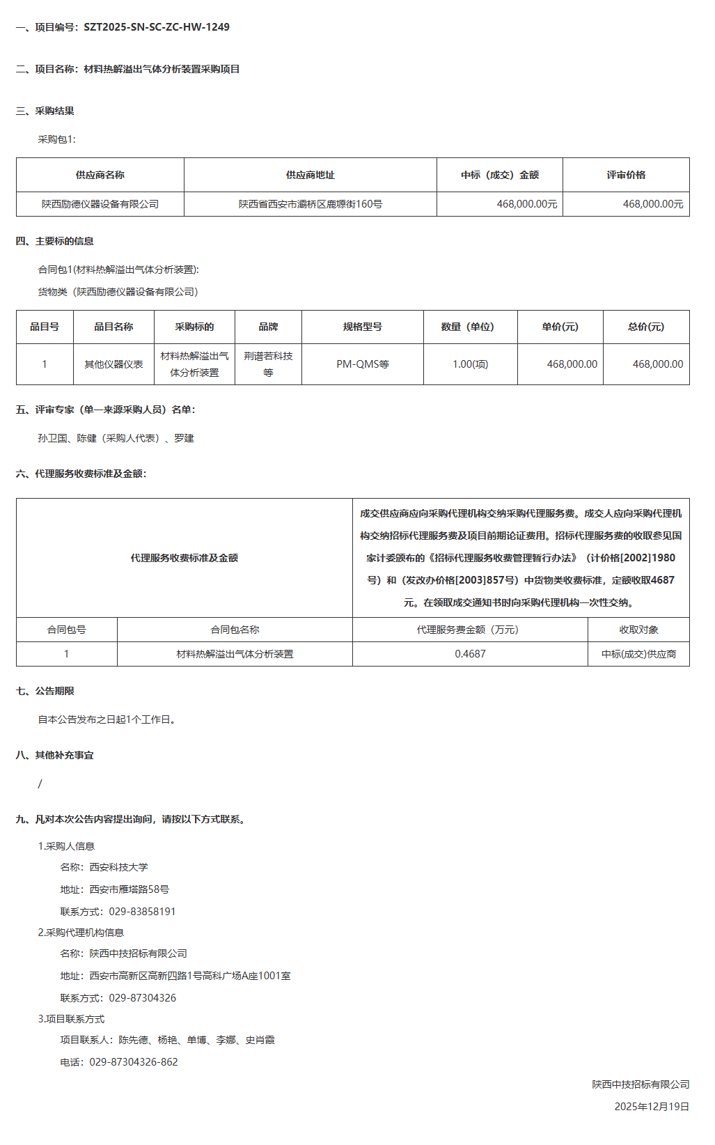 西安科技大学材料热解溢出气体分析装置采购项目中标(成交)结果公告