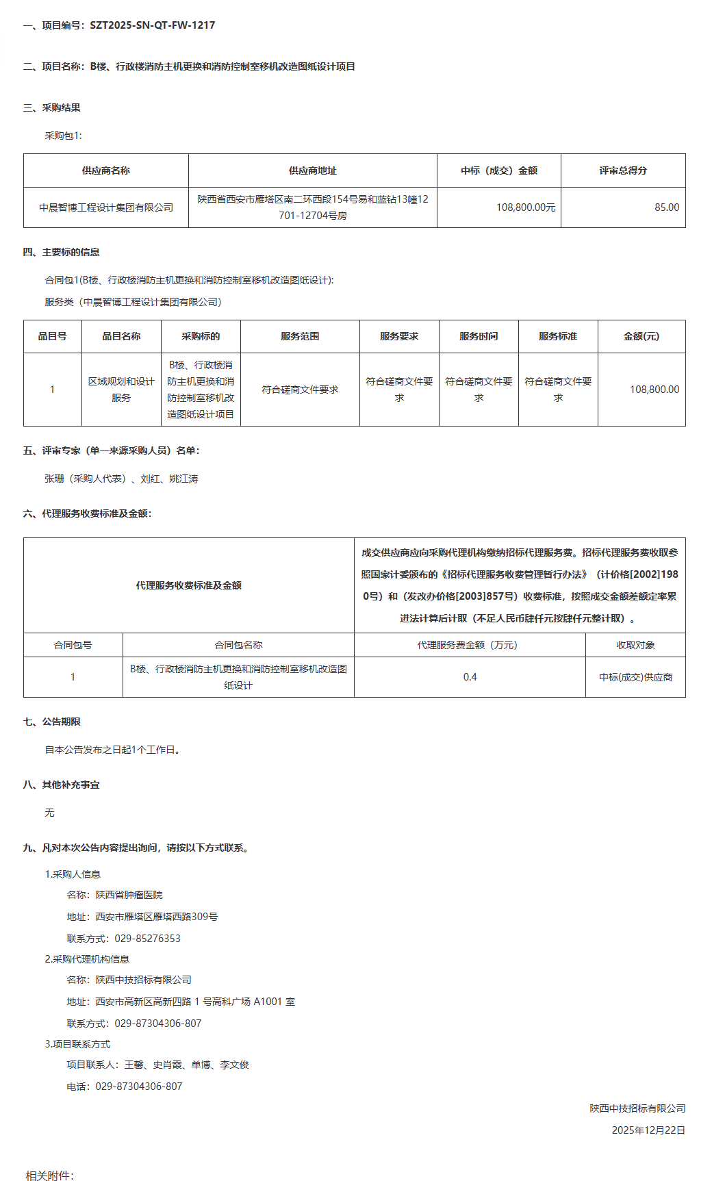 陕西省肿瘤医院B楼、行政楼消防主机更换和消防控制室移机改造图纸设计项目中标(成交)结果公告