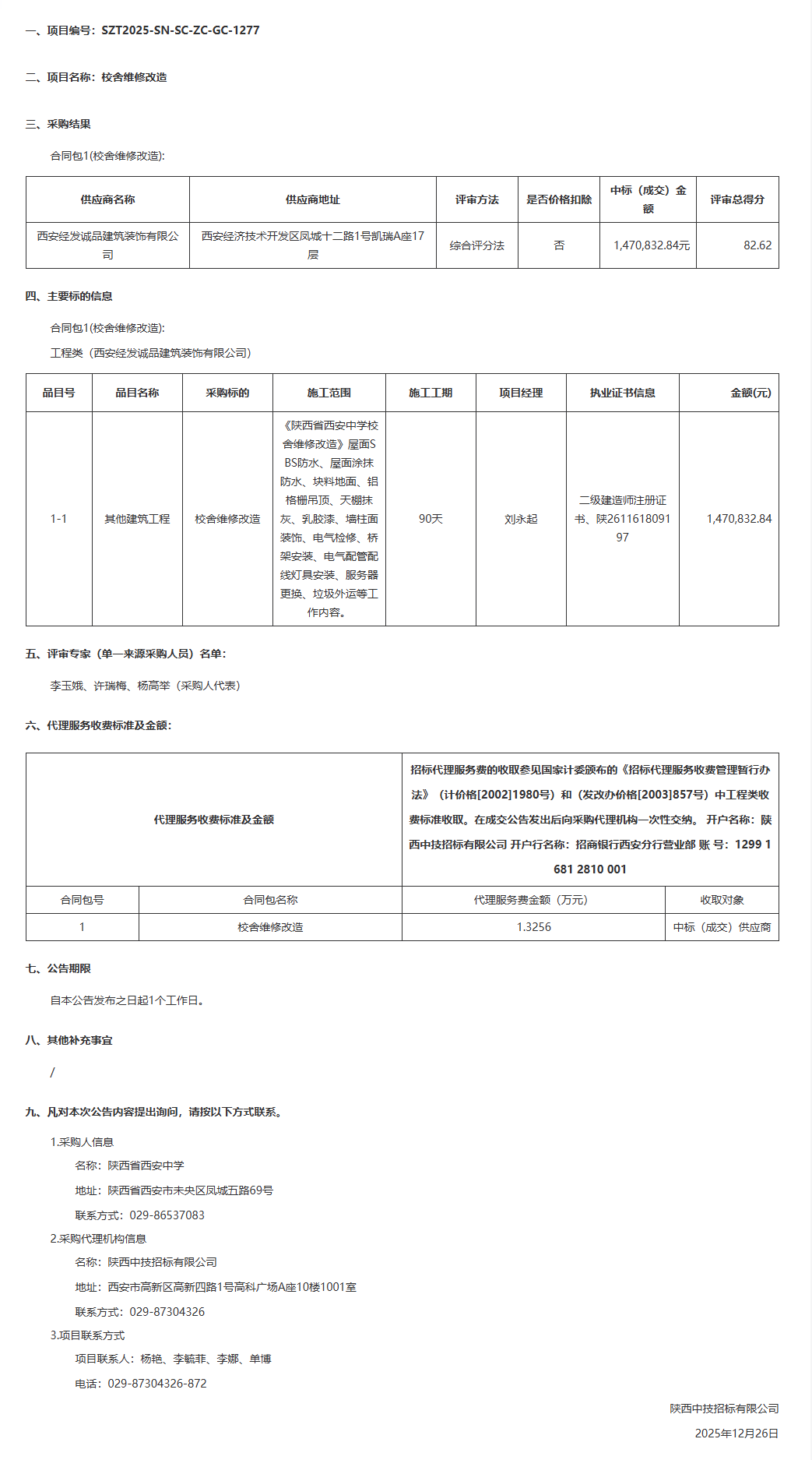 陕西省西安中学校舍维修改造中标(成交)结果公告