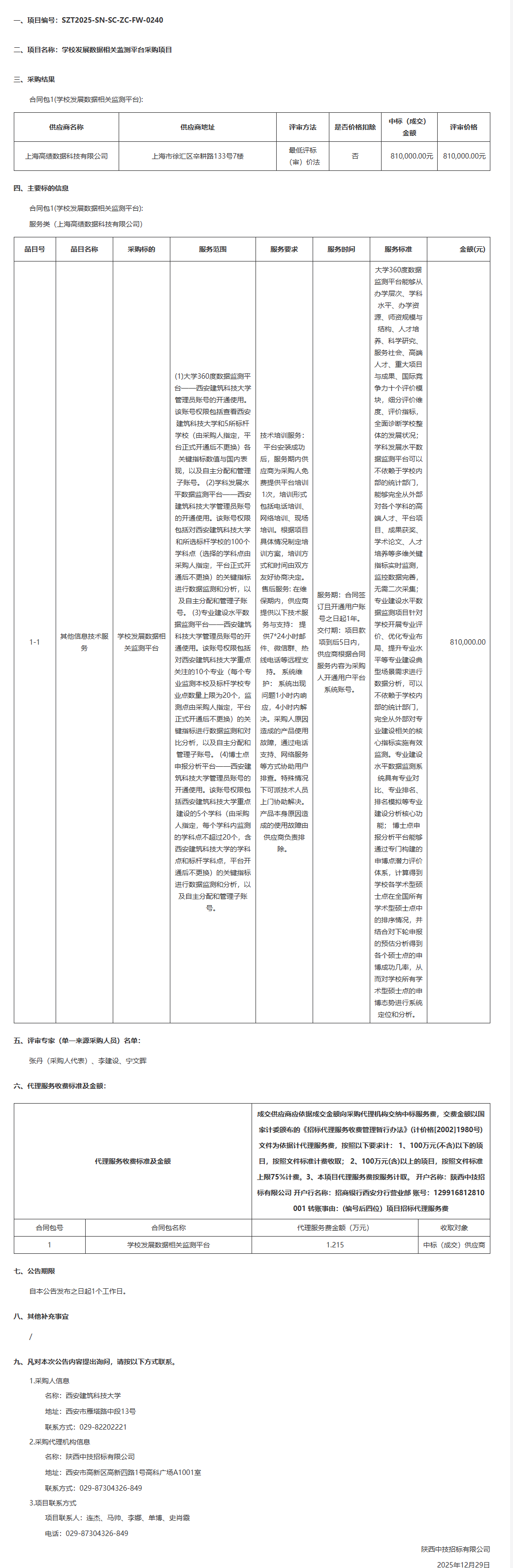 西安建筑科技大学学校发展数据相关监测平台采购项目中标(成交)结果公告