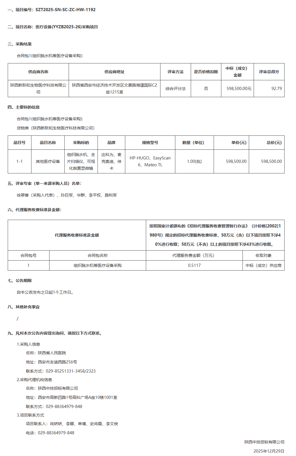 陕西省人民医院医疗设备(YYZB2025-26)采购项目中标(成交)结果公告