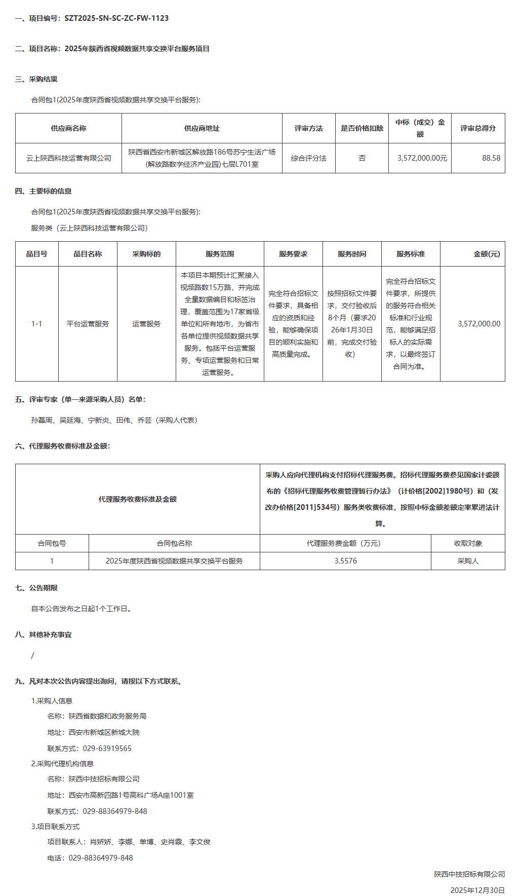 陕西省数据和政务服务局2025年陕西省视频数据共享交换平台服务项目中标(成交)结果公告