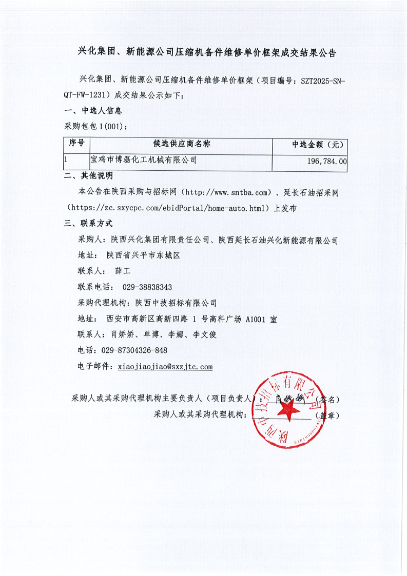 兴化集团、新能源公司压缩机备件维修单价框架成交结果公告