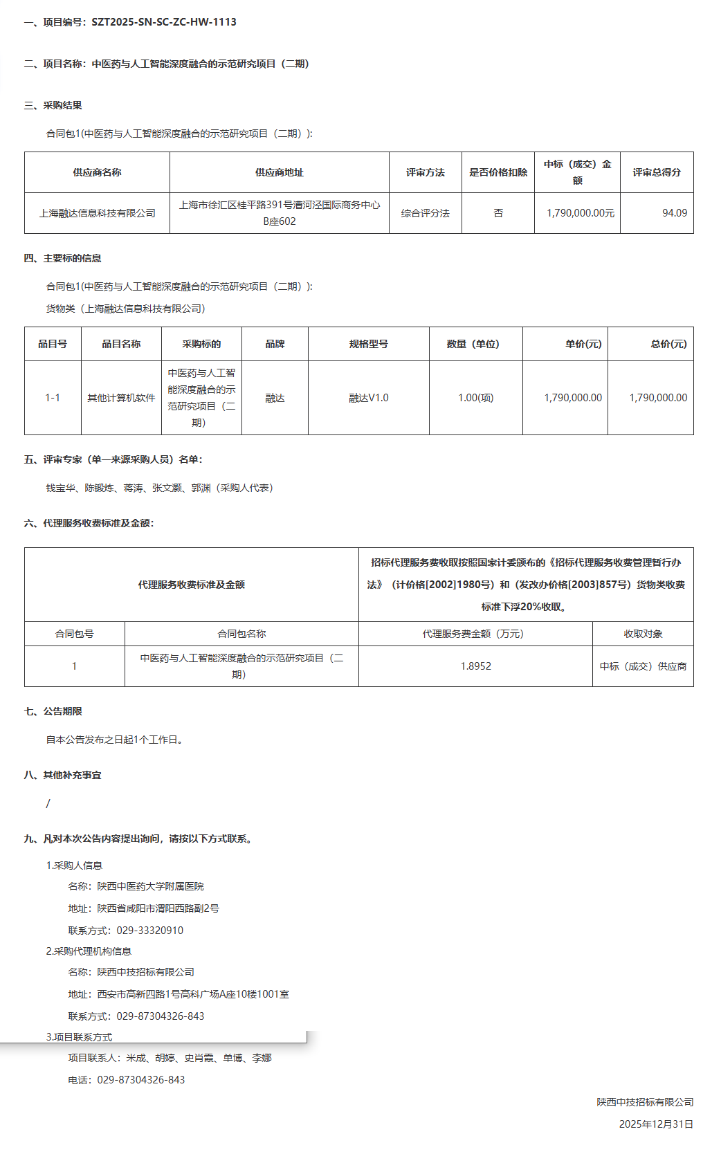 陕西中医药大学附属医院中医药与人工智能深度融合的示范研究项目(二期)中标(成交)结果公告