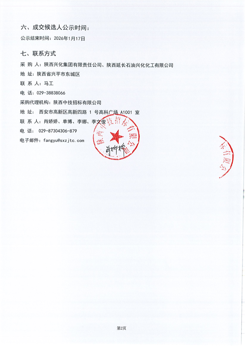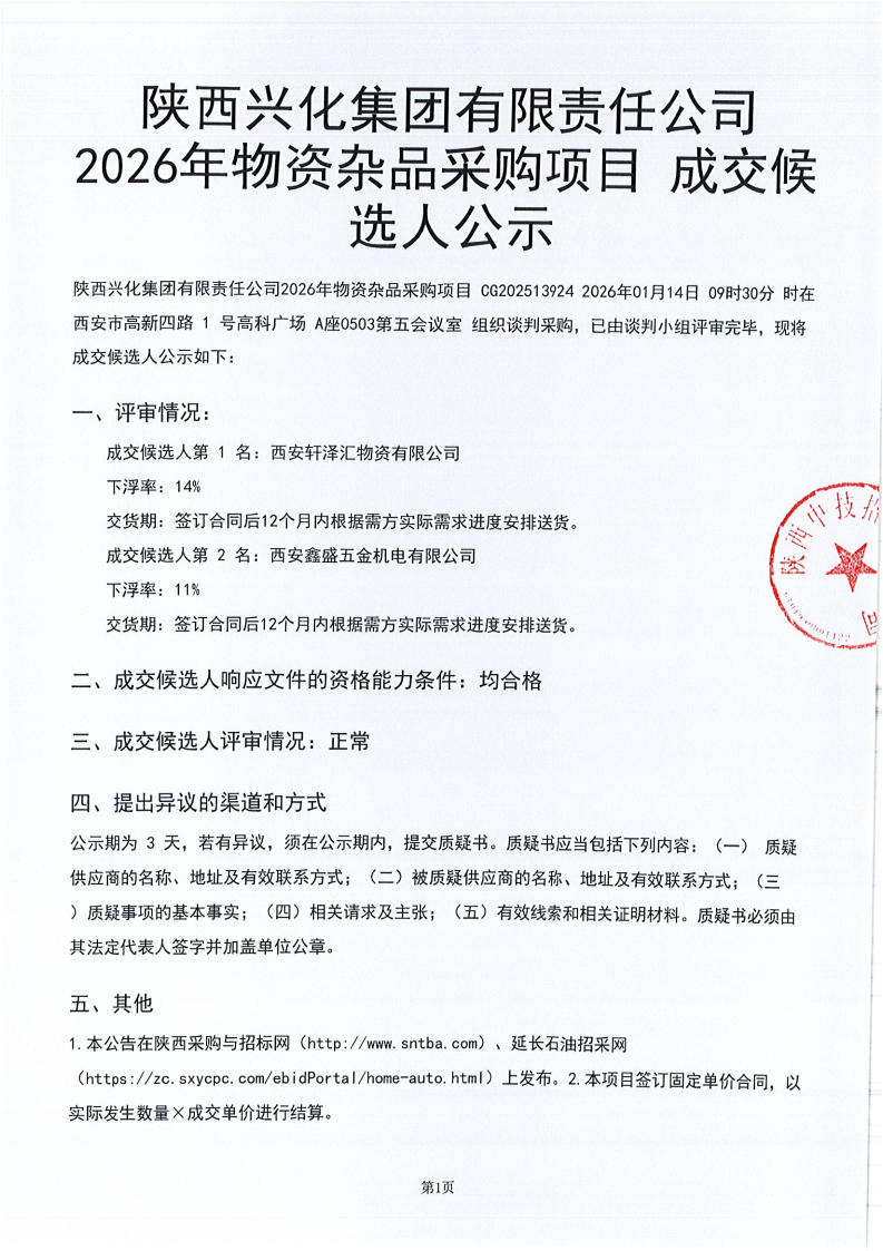 陕西兴化集团有限责任公司2026年物资杂品采购项目成交候选人公示