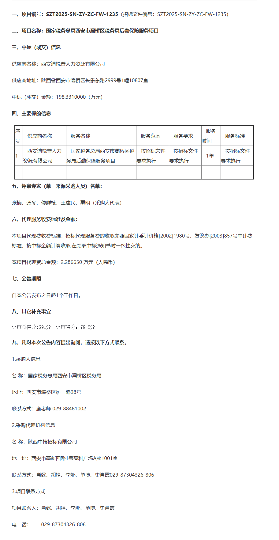 国家税务总局西安市灞桥区税务局后勤保障服务项目中标公告