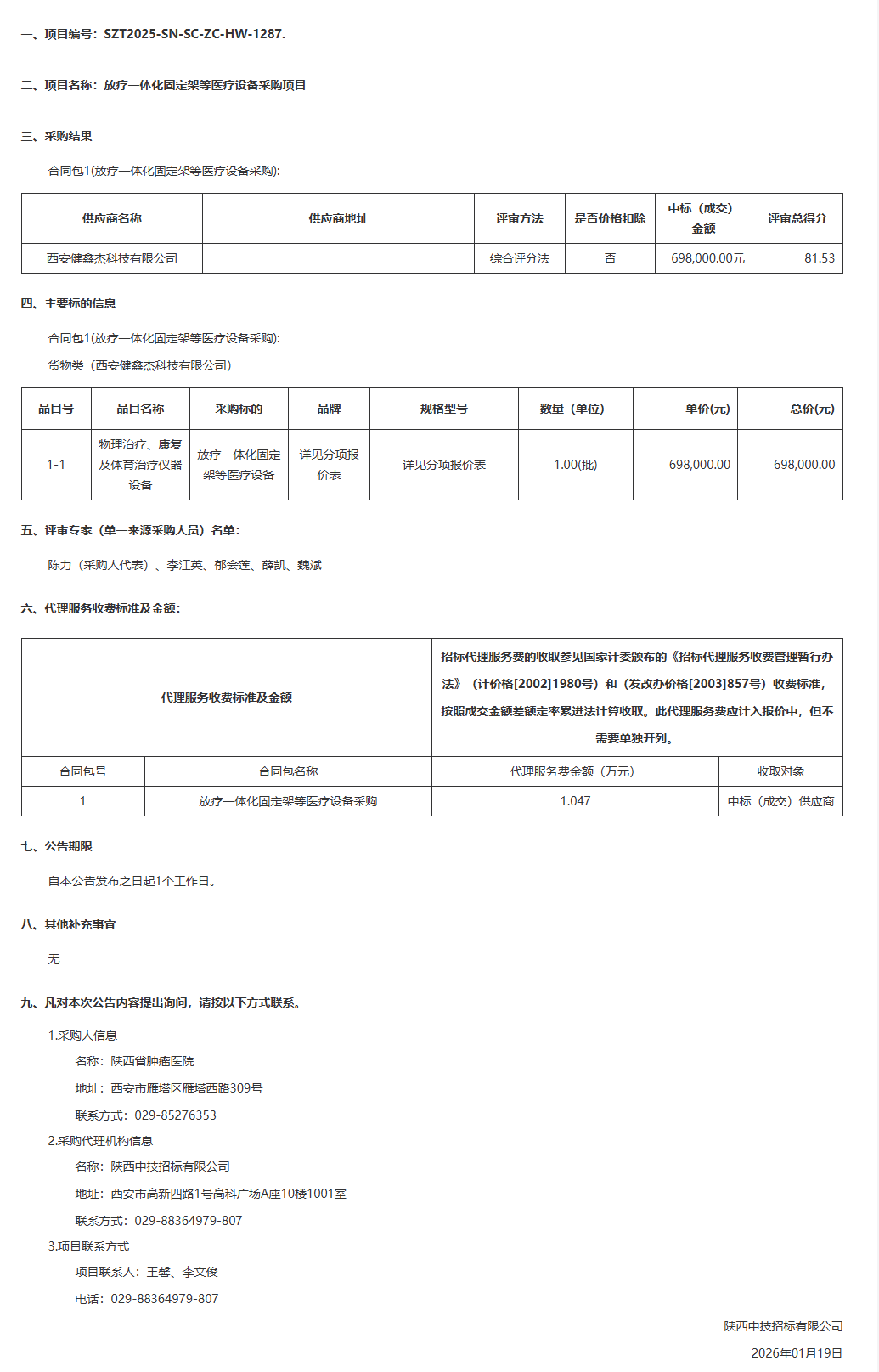 陕西省肿瘤医院放疗一体化固定架等医疗设备采购项目中标(成交)结果公告