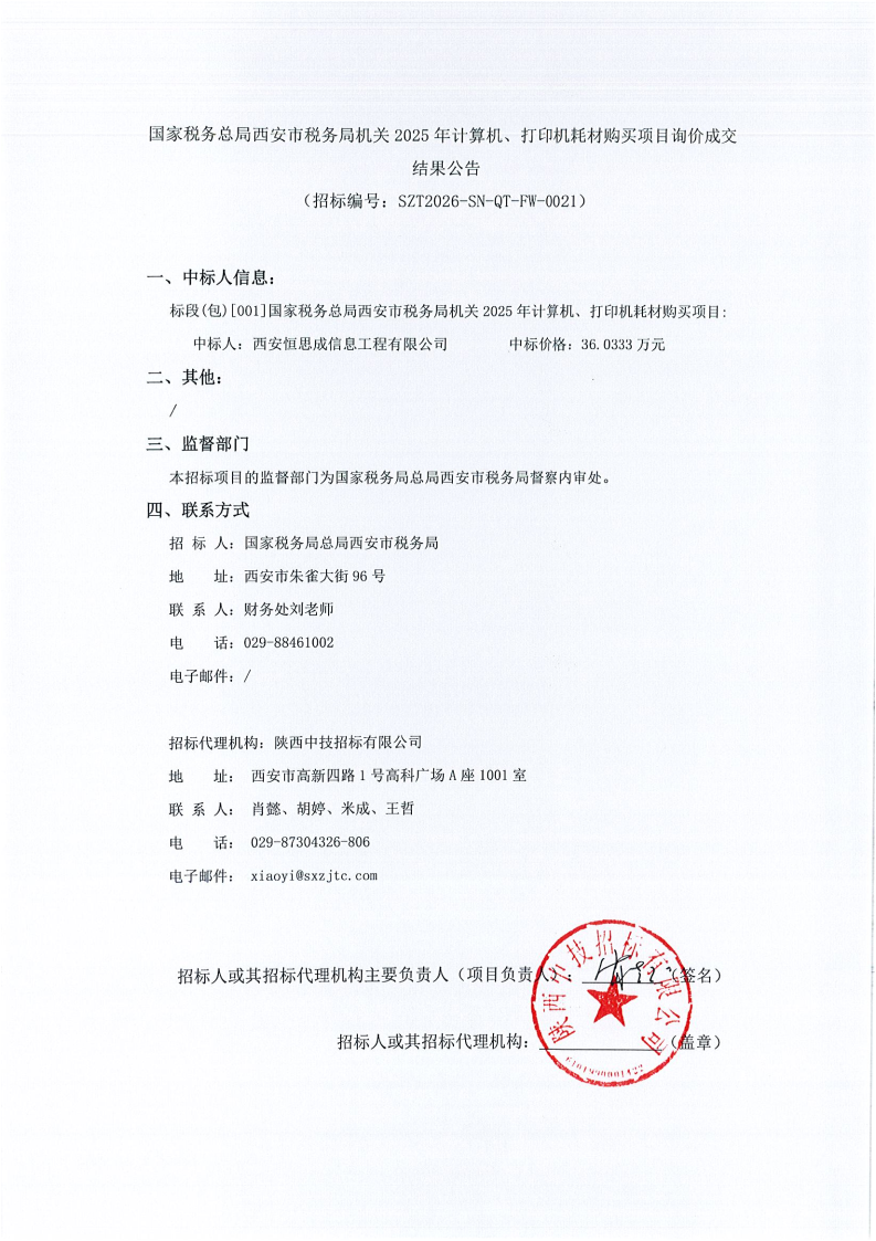 国家税务总局西安市税务局机关2025年计算机、打印机耗材购买项目询价成交结果公告