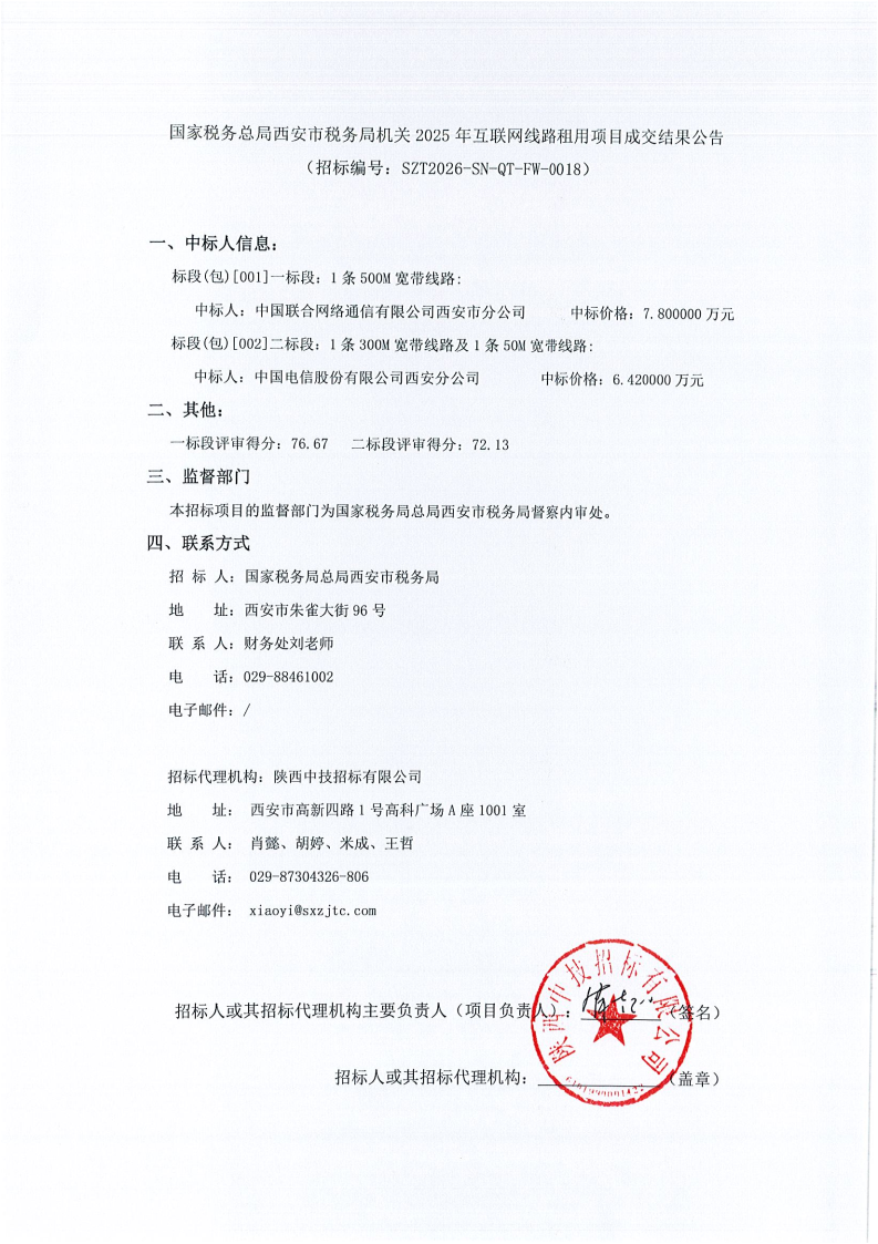 国家税务总局西安市税务局机关2025年互联网线路租用项目成交结果公告