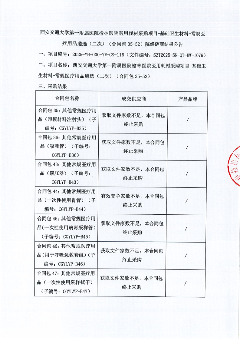 西安交通大学第一附属医院榆林医院医用耗材采购项目-基础卫生材料-常规医疗用品遴选(二次)(合同包35-52)院级磋商结果公告