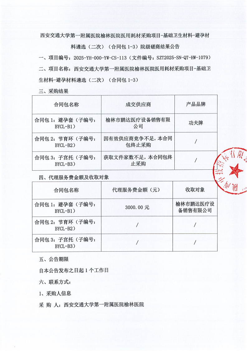 西安交通大学第一附属医院榆林医院医用耗材采购项目-基础卫生材料-避孕材料遴选(二次)(合同包1-3)院级磋商结果公告