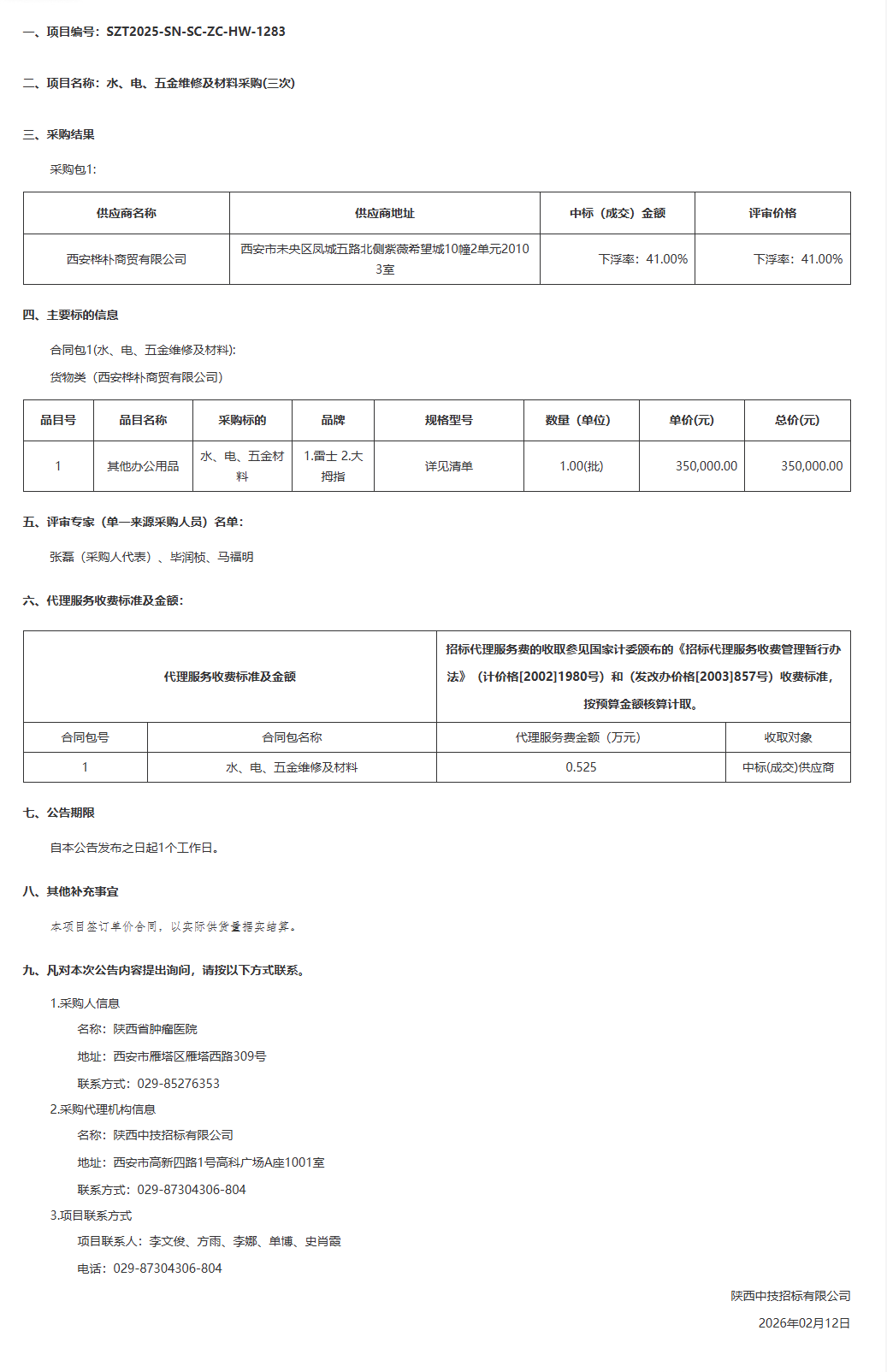 陕西省肿瘤医院水、电、五金维修及材料采购(三次)中标(成交)结果公告