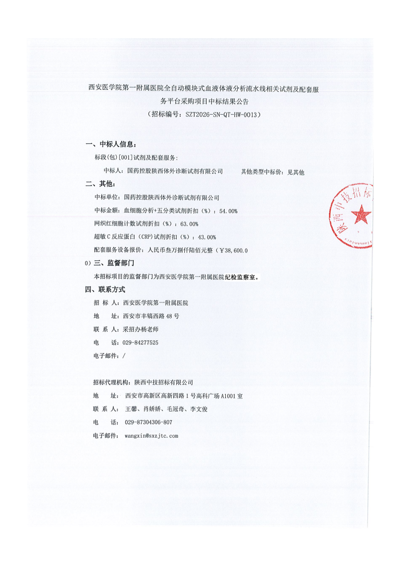 西安医学院第一附属医院全自动模块式血液体液分析流水线相关试剂及配套服务平台采购项目中标结果公告