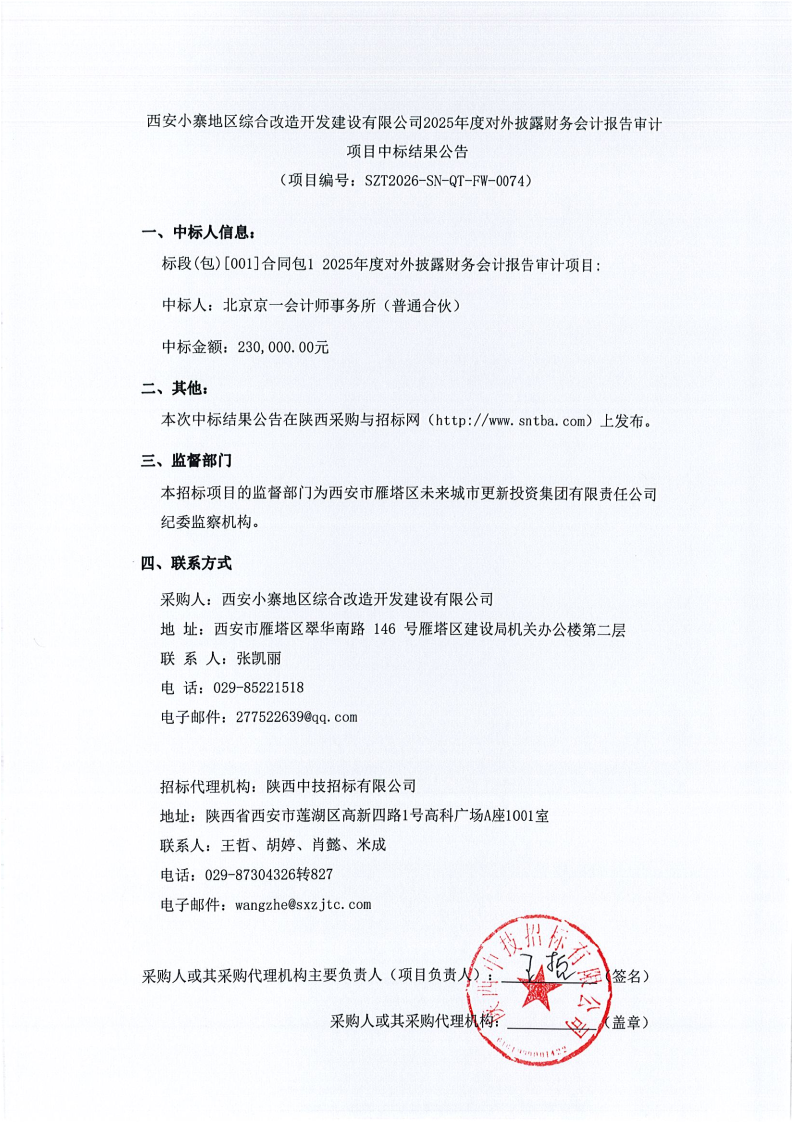 西安小寨地区综合改造开发建设有限公司2025年度对外披露财务会计报告审计项目中标结果公告