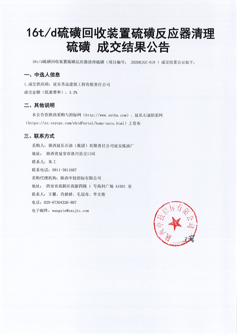 16t、d硫磺回收装置硫磺反应器清理硫磺成交结果公告