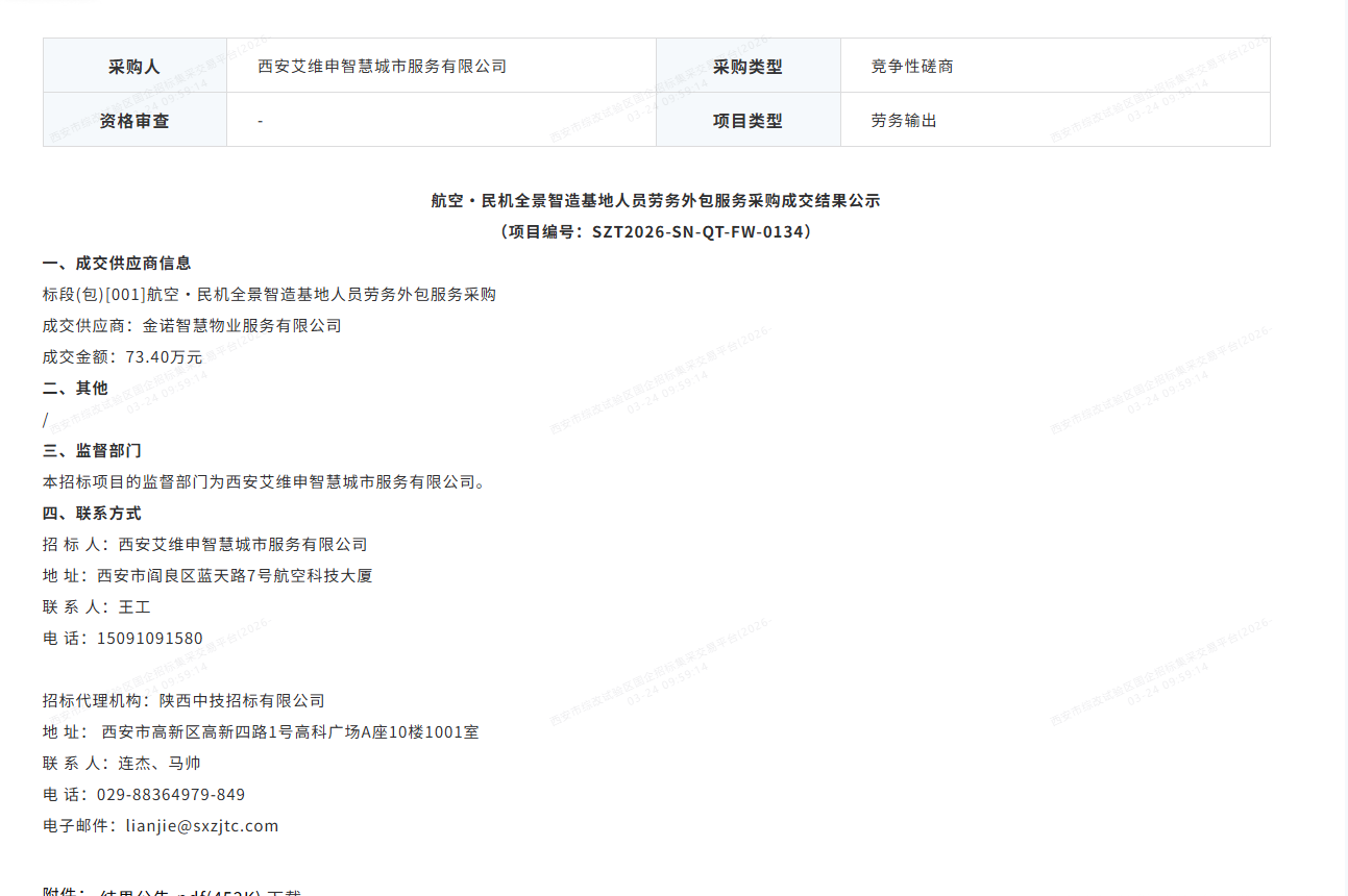 航空·民机全景智造基地人员劳务外包服务采购成交结果公示