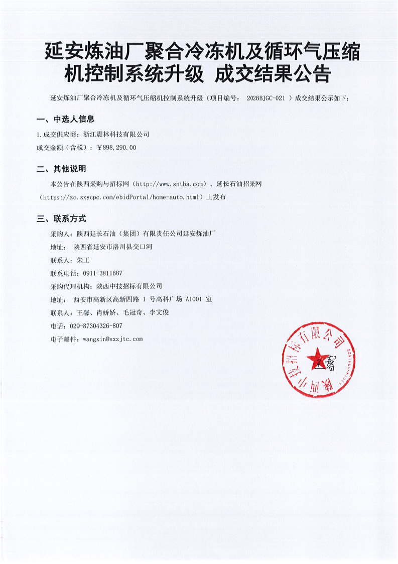延安炼油厂聚合冷冻机及循环气压缩机控制系统升级成交结果公告