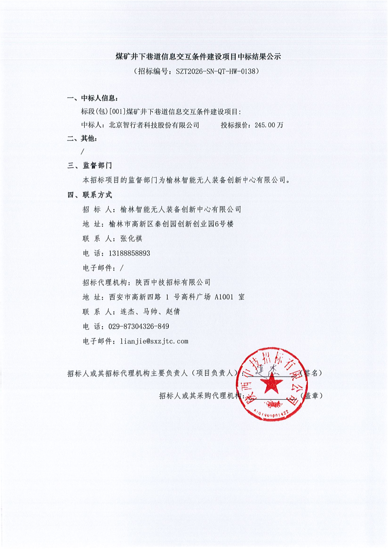 煤矿井下巷道信息交互条件建设项目中标结果公示