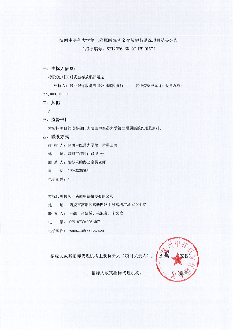 陕西中医药大学第二附属医院资金存放银行遴选项目结果公告