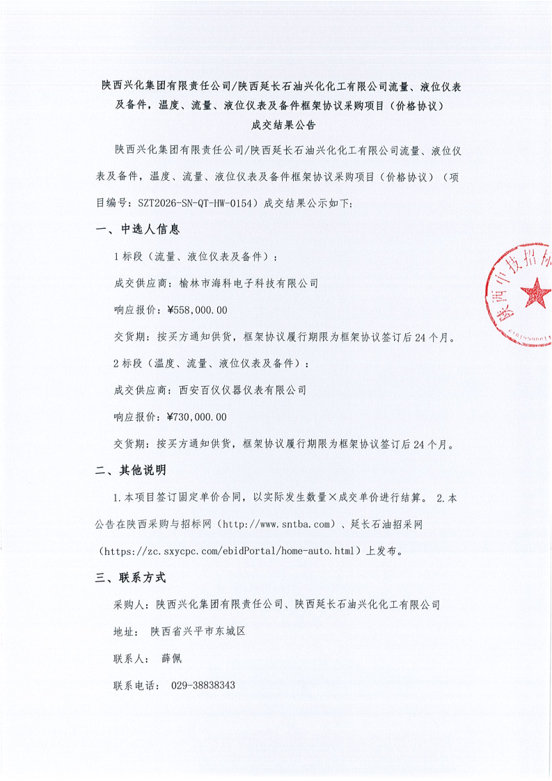 陕西兴化集团有限责任公司陕西延长石油兴化化工有限公司流量、液位仪表及备件,温度、流量、液位仪表及备件框架协议采购项目(价格协议)成交结果公告