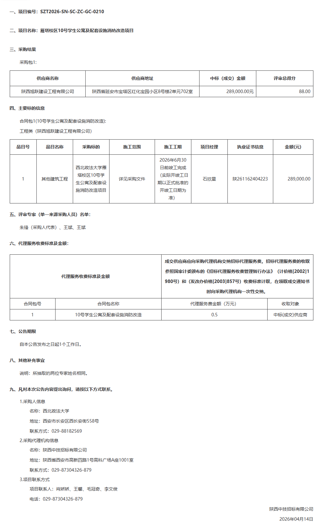 西北政法大学雁塔校区10号学生公寓及配套设施消防改造项目成交结果公告