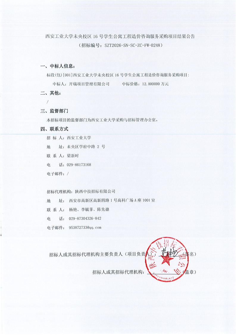 西安工业大学未央校区16号学生公寓工程造价咨询服务采购项目结果公告