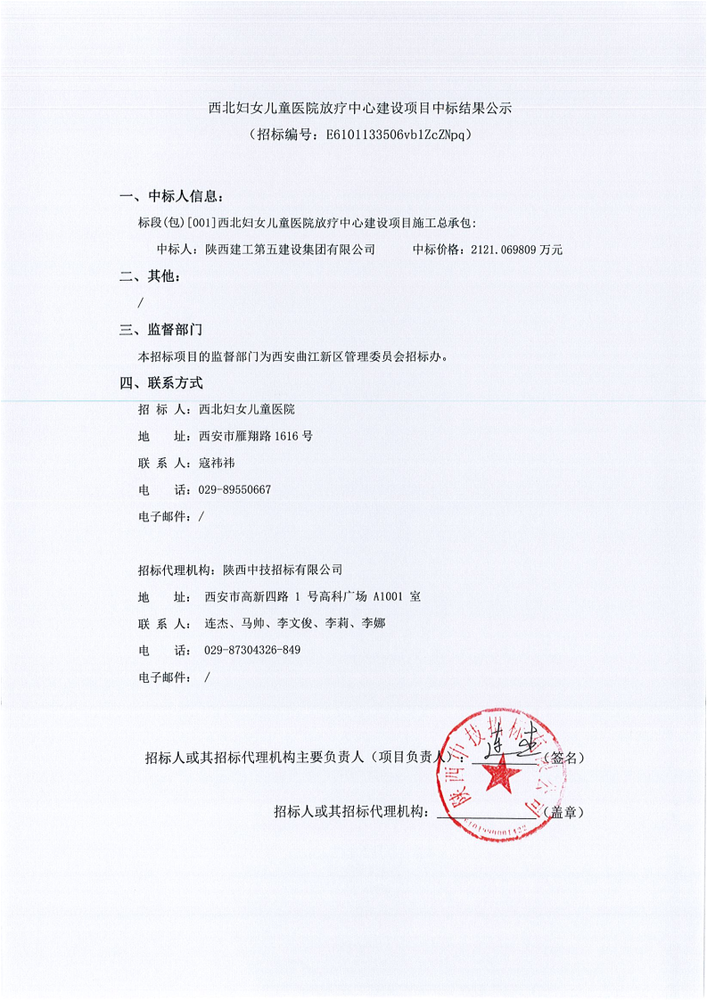 西北妇女儿童医院放疗中心建设项目中标结果公示