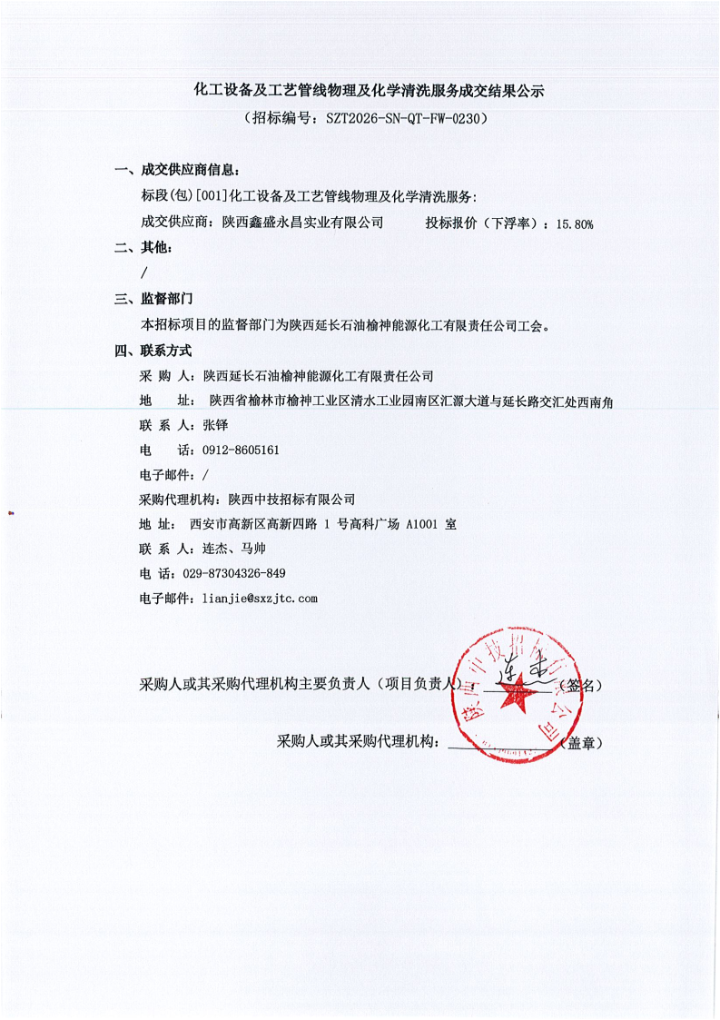 化工设备及工艺管线物理及化学清洗服务成交结果公示