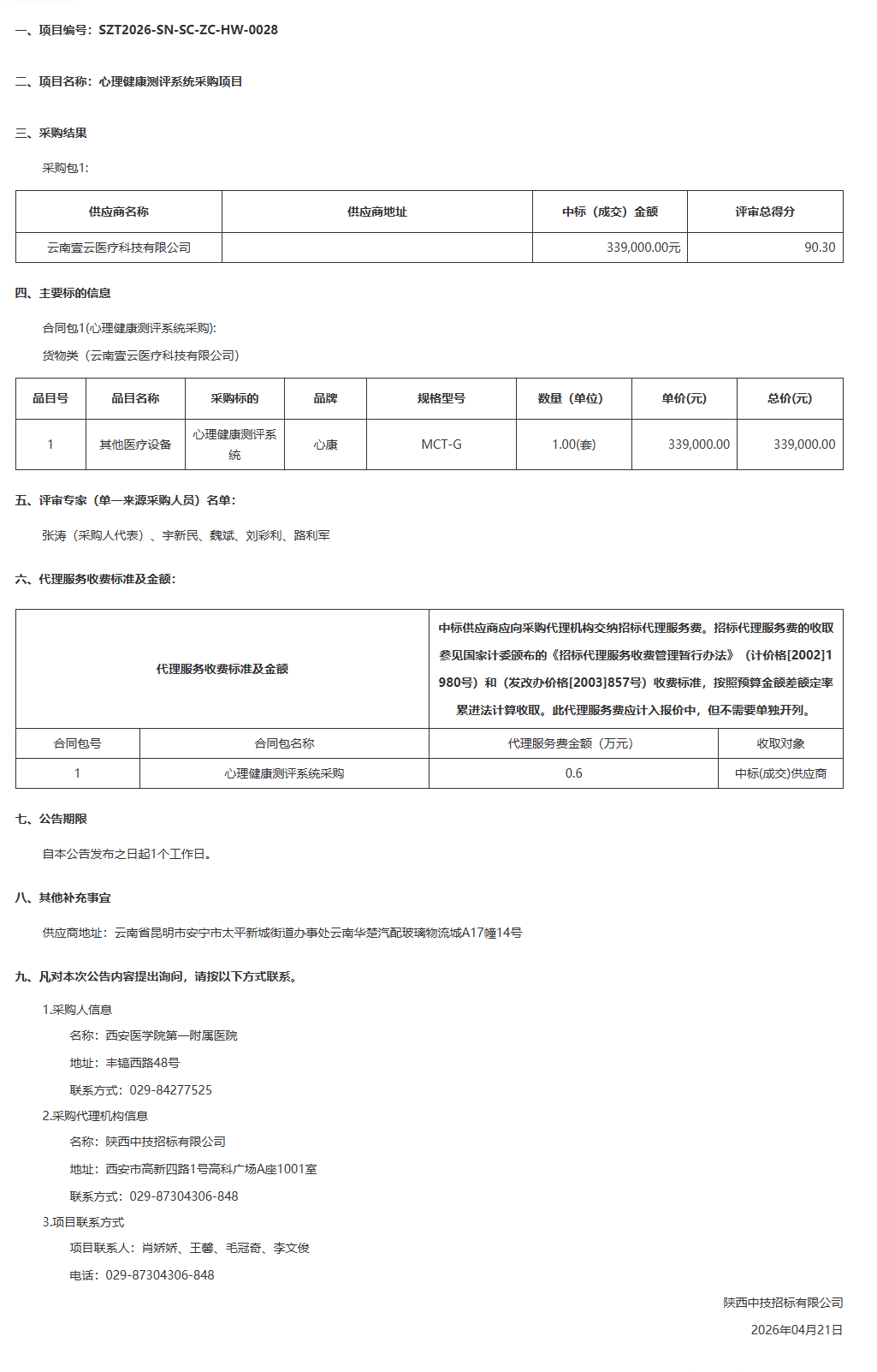 西安医学院第一附属医院心理健康测评系统采购项目中标(成交)结果公告