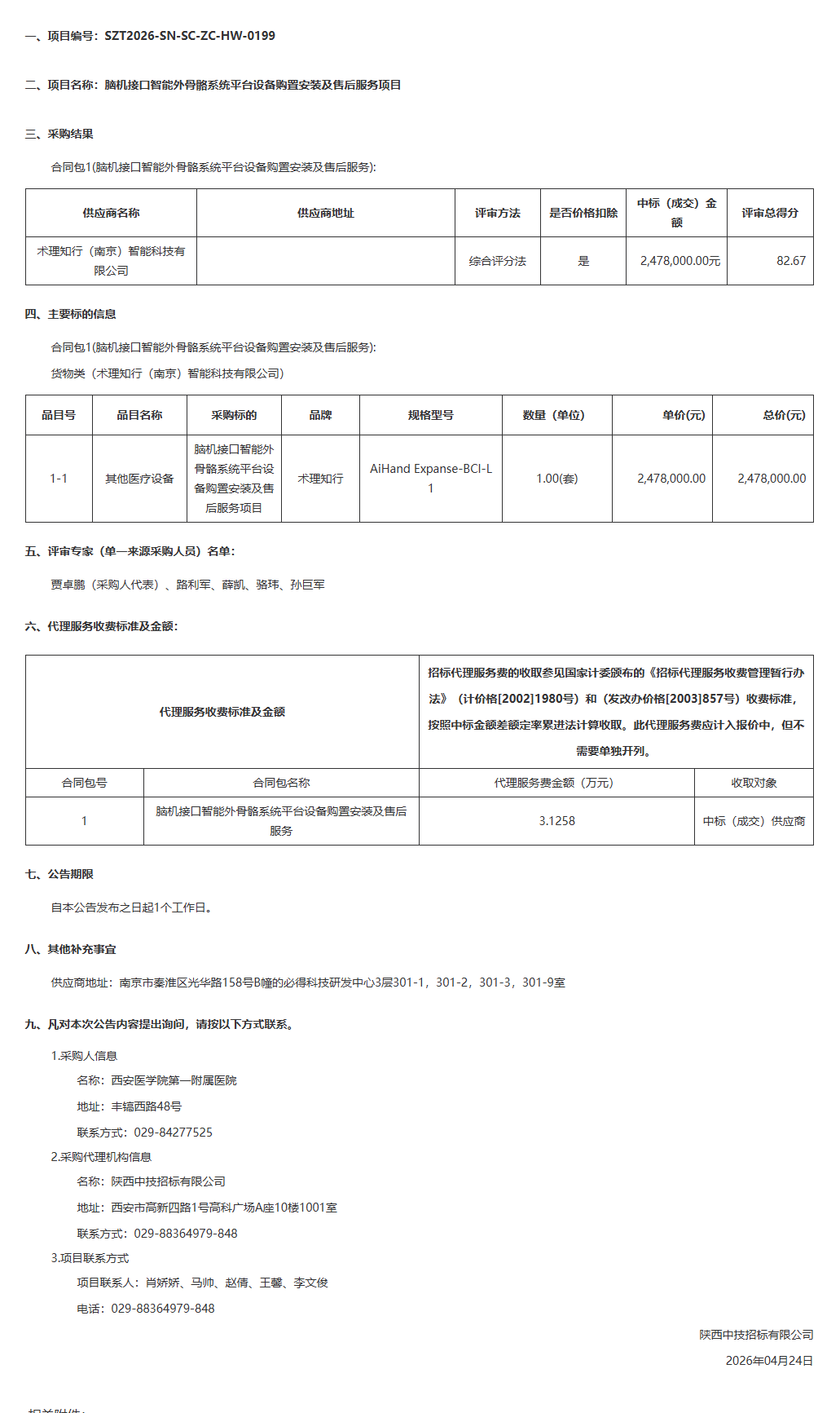 西安医学院第一附属医院脑机接口智能外骨骼系统平台设备购置安装及售后服务项目中标(成交)结果公告