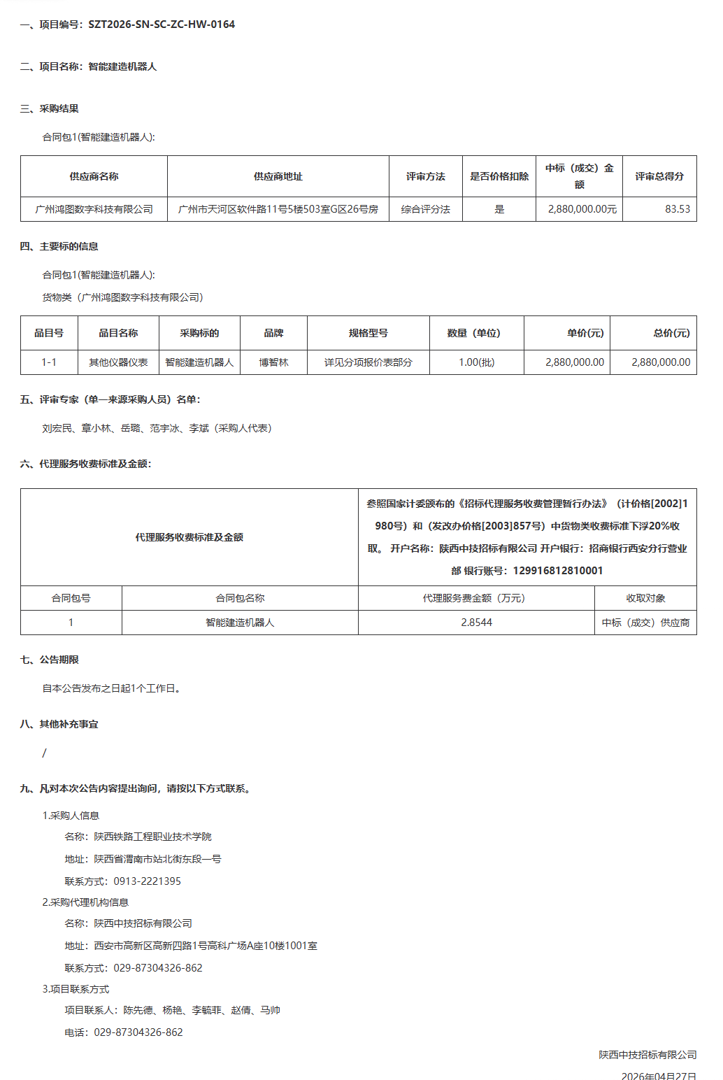 陕西铁路工程职业技术学院智能建造机器人中标(成交)结果公告