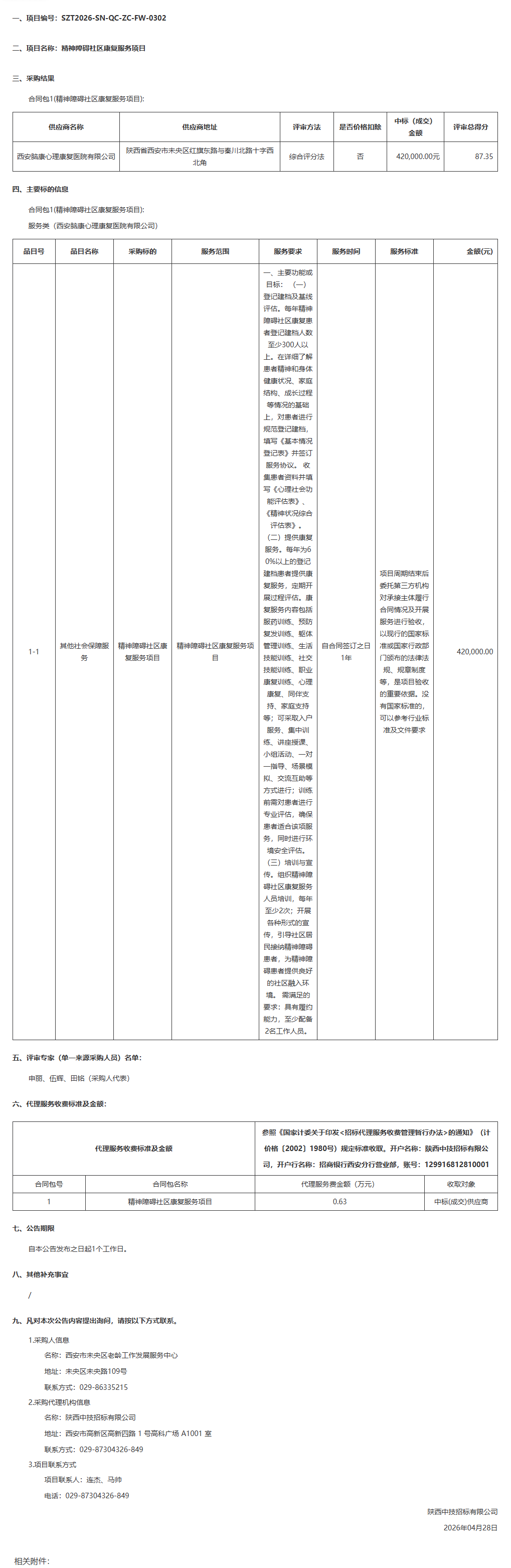 西安市未央区老龄工作发展服务中心精神障碍社区康复服务项目中标(成交)结果公告