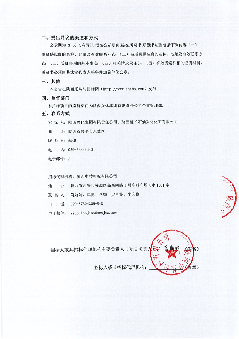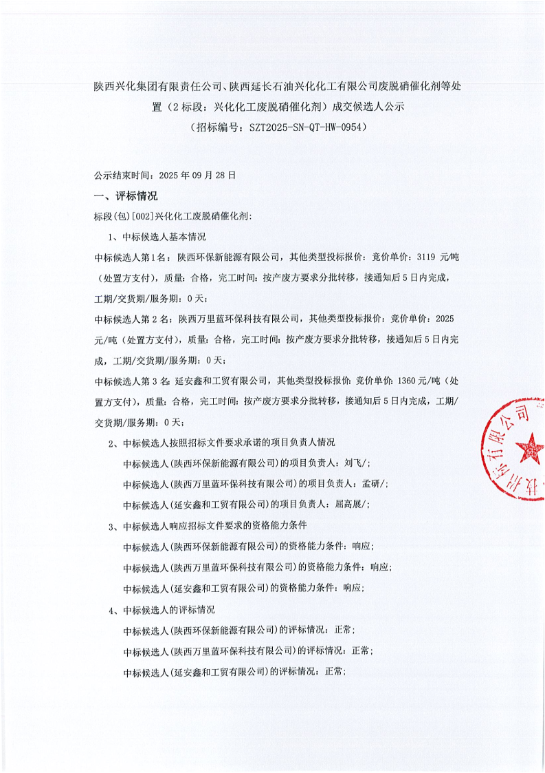 陕西兴化集团有限责任公司、陕西延长石油兴化化工有限公司废脱硝催化剂等处置(2标段:兴化化工废脱硝催化剂)成交候选人公示