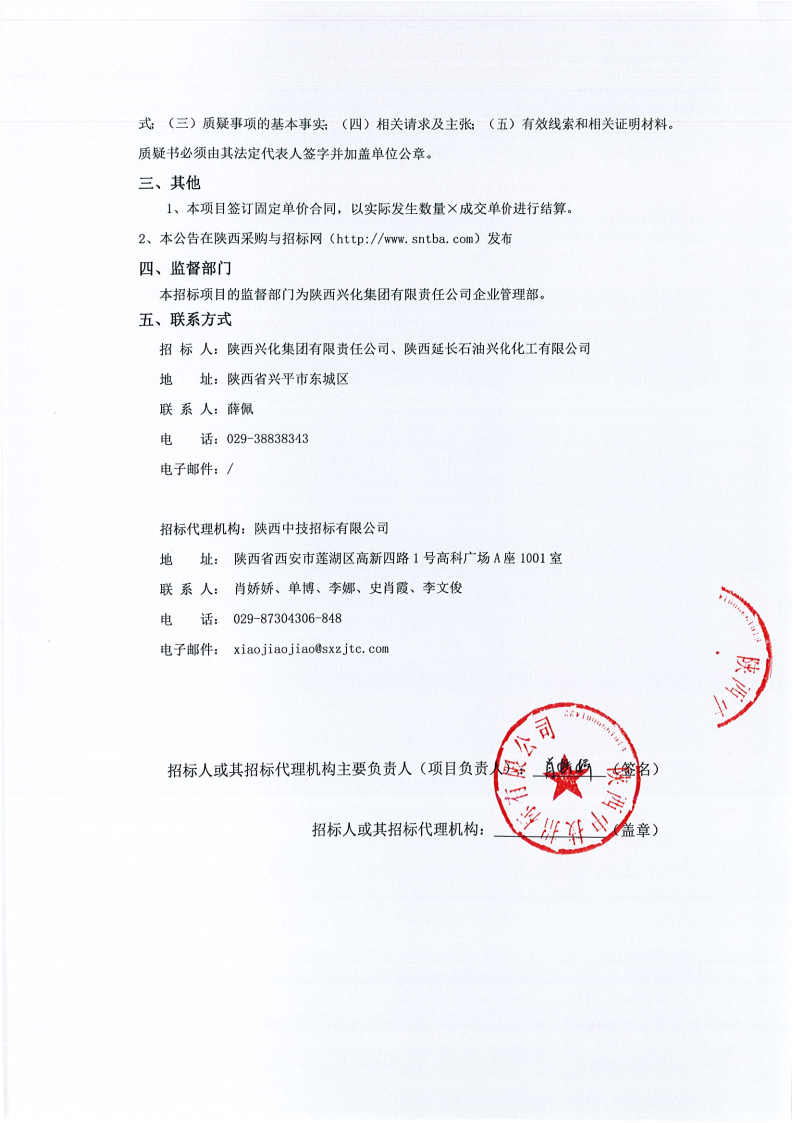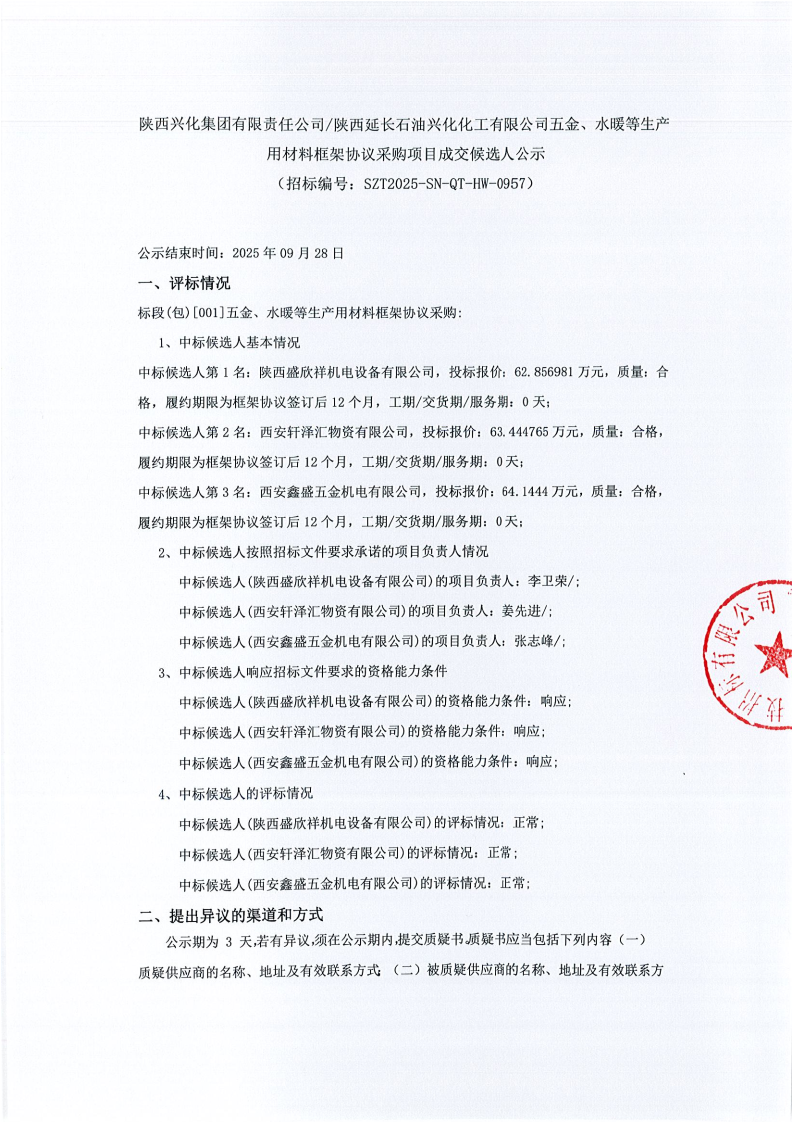 陕西兴化集团有限责任公司/陕西延长石油兴化化工有限公司五金、水暖等生产用材料框架协议采购项目成交候选人公示