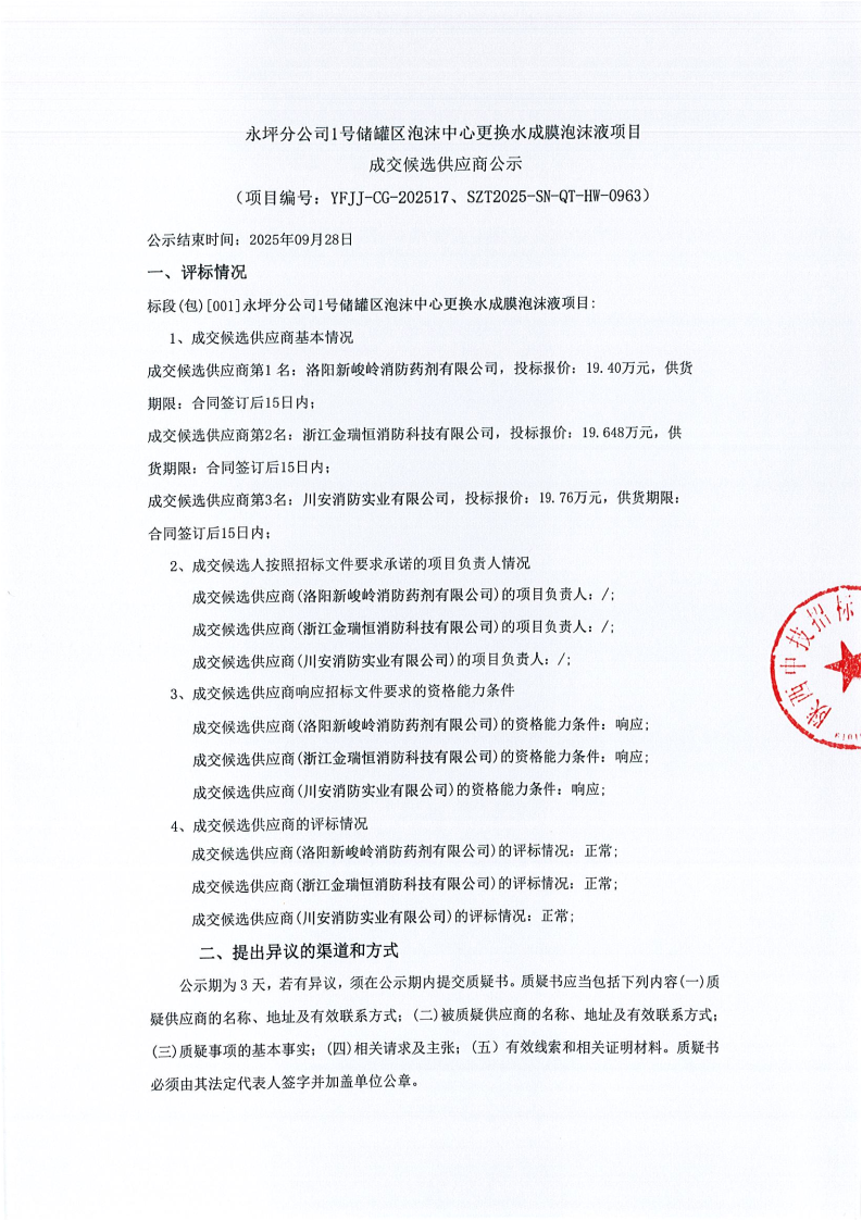 永坪分公司1号储罐区泡沫中心更换水成膜泡沫液项目成交候选供应商公示