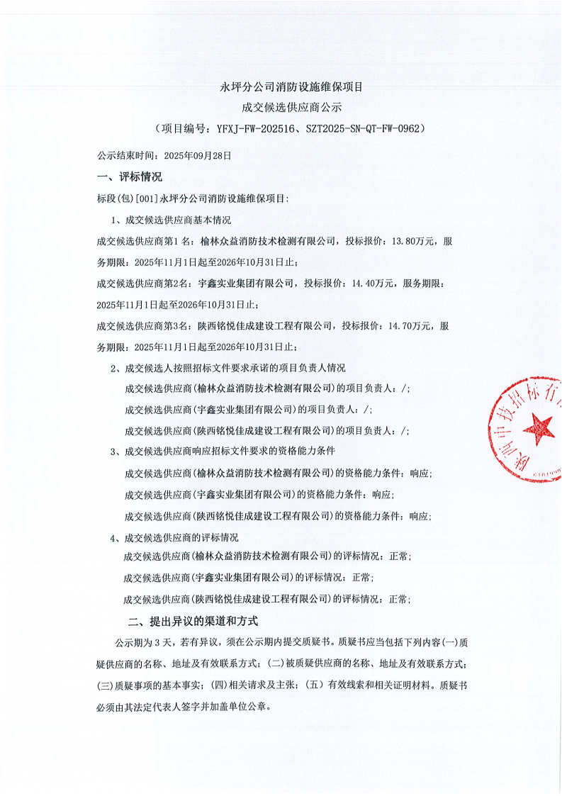永坪分公司消防设施维保项目成交候选供应商公示