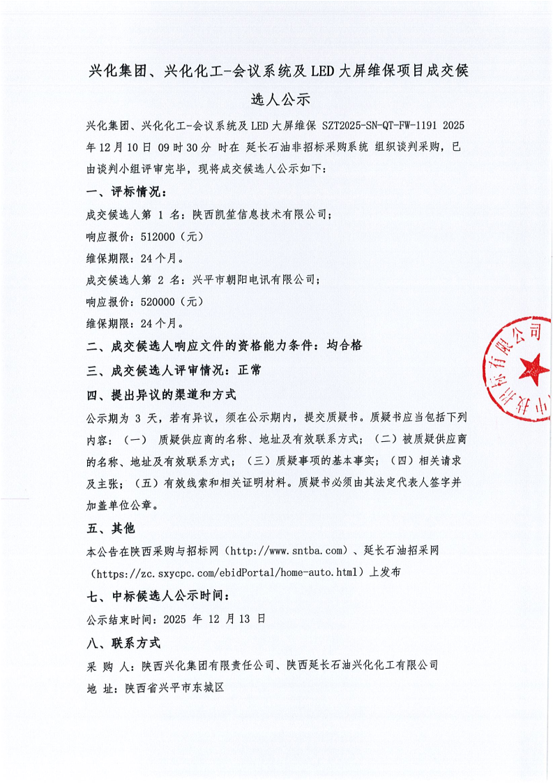 兴化集团、兴化化工-会议系统及LED大屏维保项目成交候选人公示