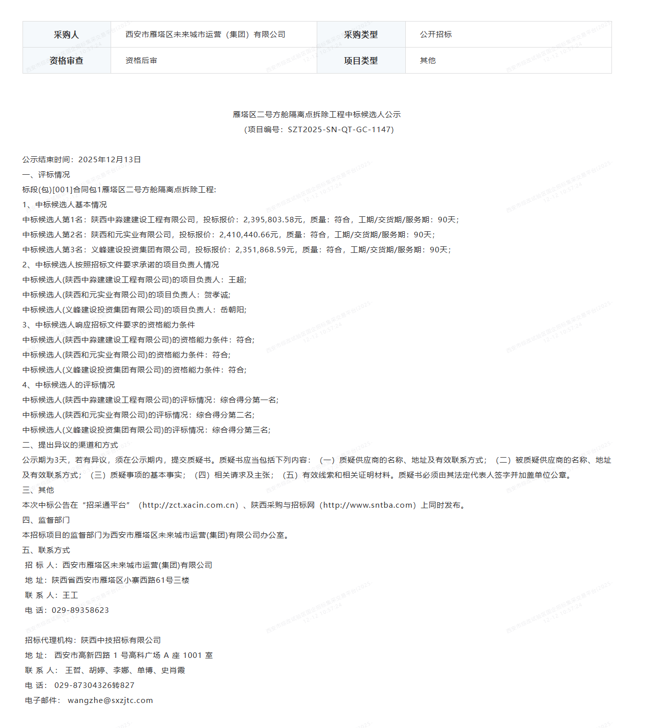 雁塔区二号方舱隔离点拆除工程中标候选人公示