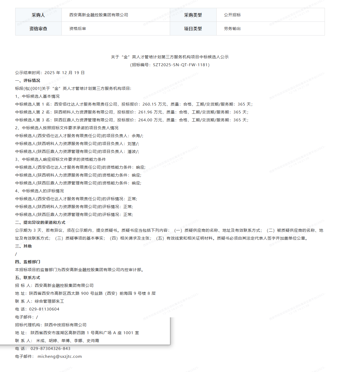 关于“金”英人才管培计划第三方服务机构项目中标候选人公示