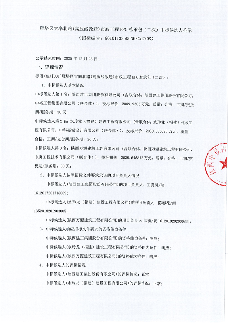 雁塔区大寨北路(高压线改迁)市政工程EPC总承包(二次)中标候选人公示