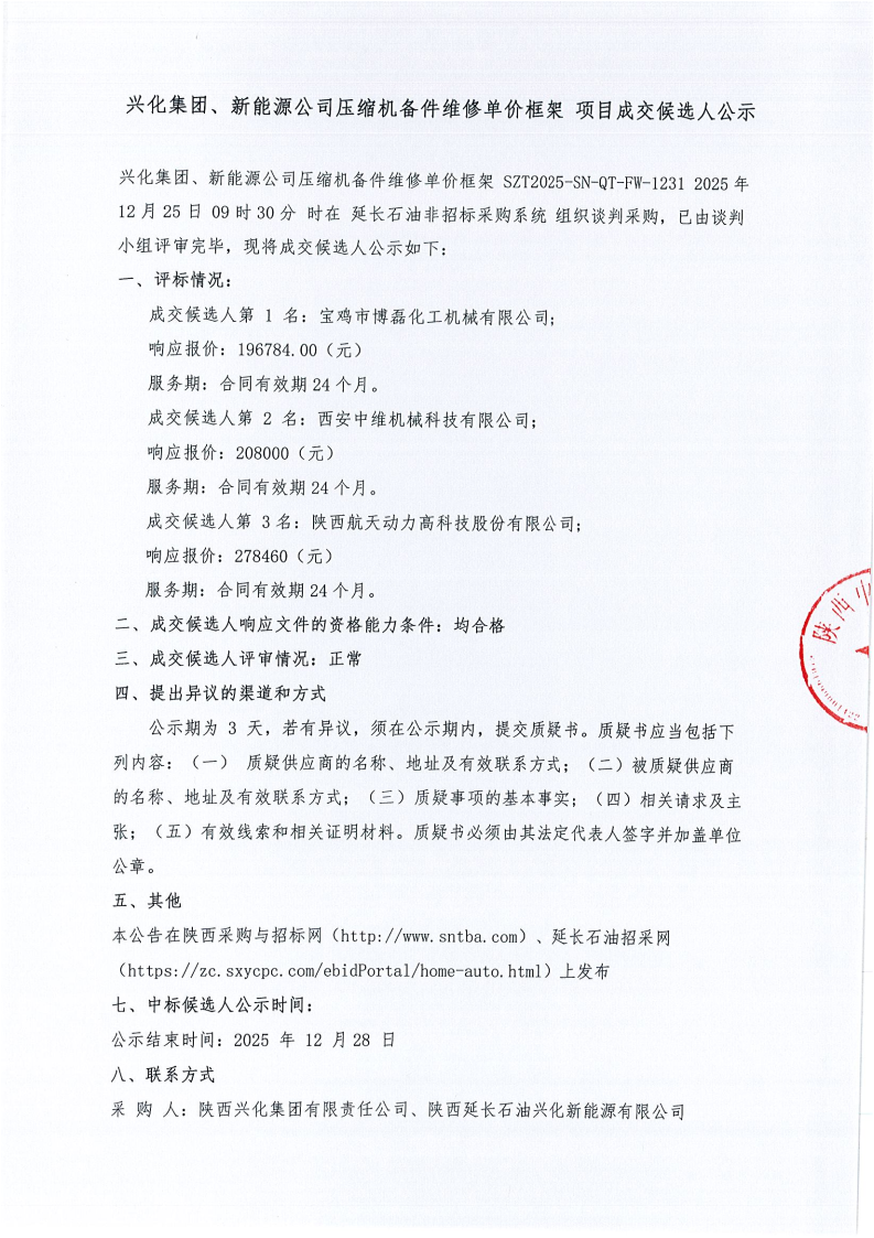 兴化集团、新能源公司压缩机备件维修单价框架项目成交候选人公示