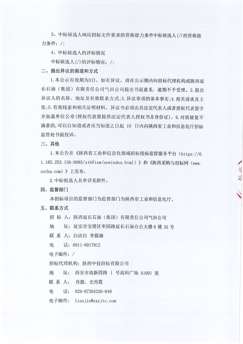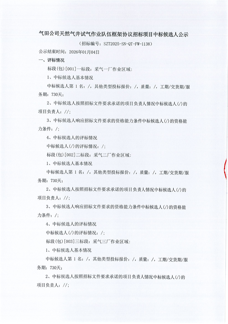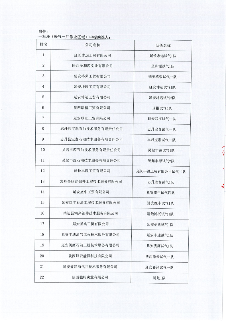 气田公司天然气井试气作业队伍框架协议招标项目中标候选人公示