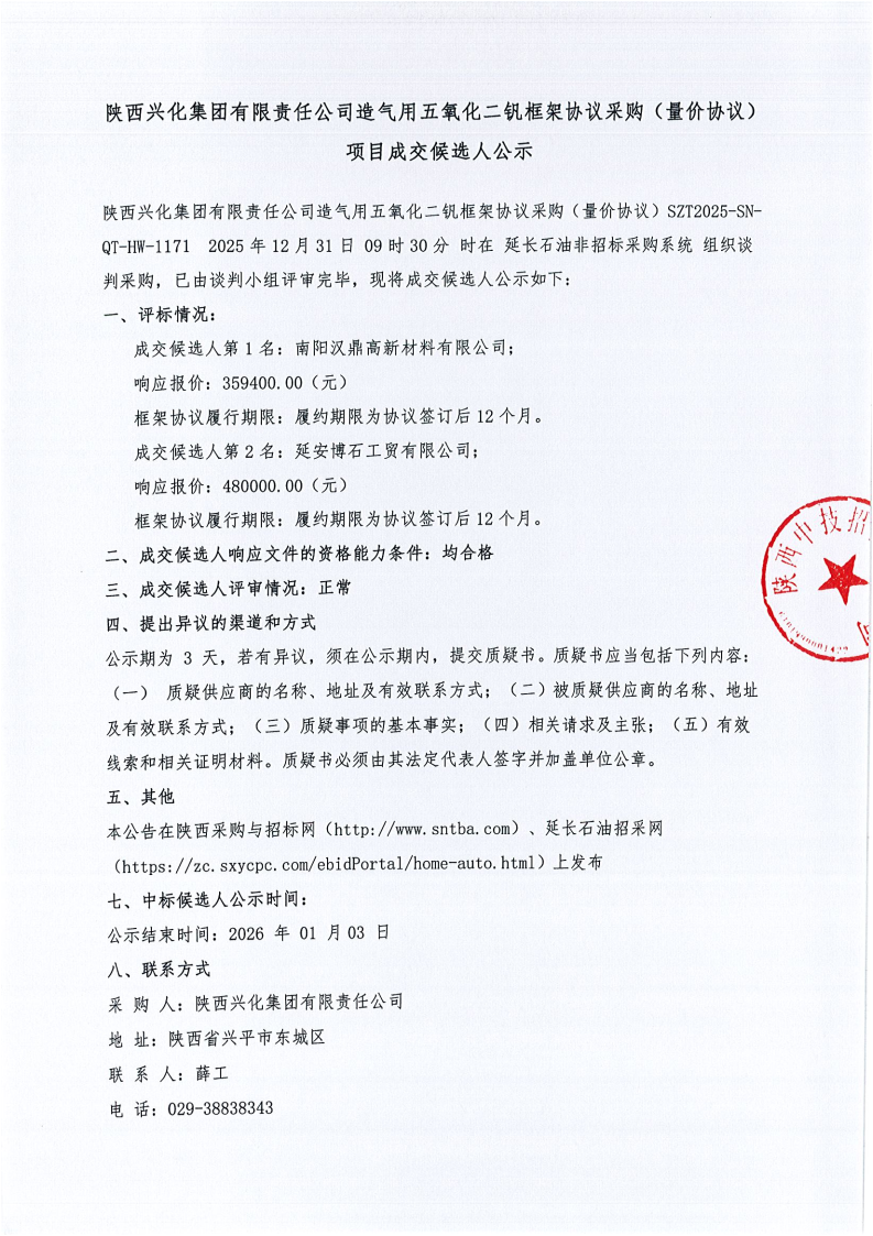 陕西兴化集团有限责任公司造气用五氧化二钒框架协议采购(量价协议)项目成交候选人公示