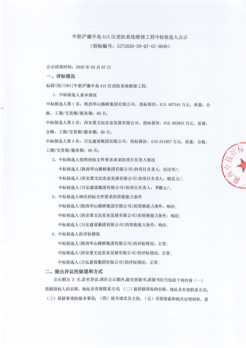 中新浐灞半岛A15区消防系统维修工程中标候选人公示