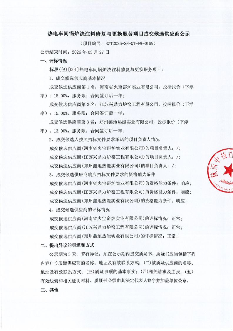 热电车间锅炉浇注料修复与更换服务项目成交候选供应商公示