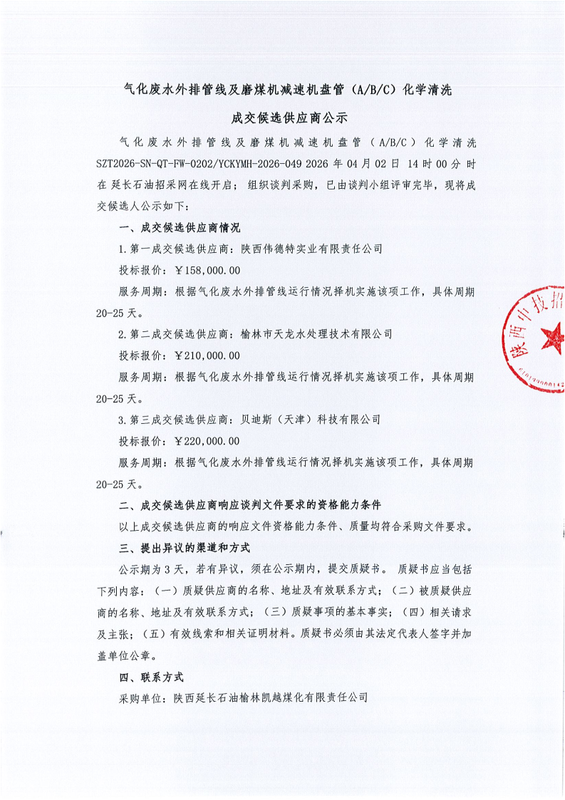 气化废水外排管线及磨煤机减速机盘管(A、B、C)化学清洗成交候选供应商公示